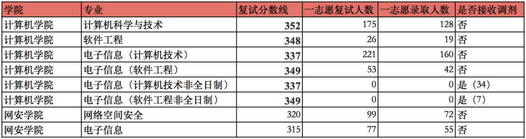 计算机学院计算机科学与技术、电子信息(计算机技术),网安学院所有专业初试科目统一为:①101|思想政治理论 ②201|英语一 ③301|数学一 ④408|计算机学科专业基础综合
